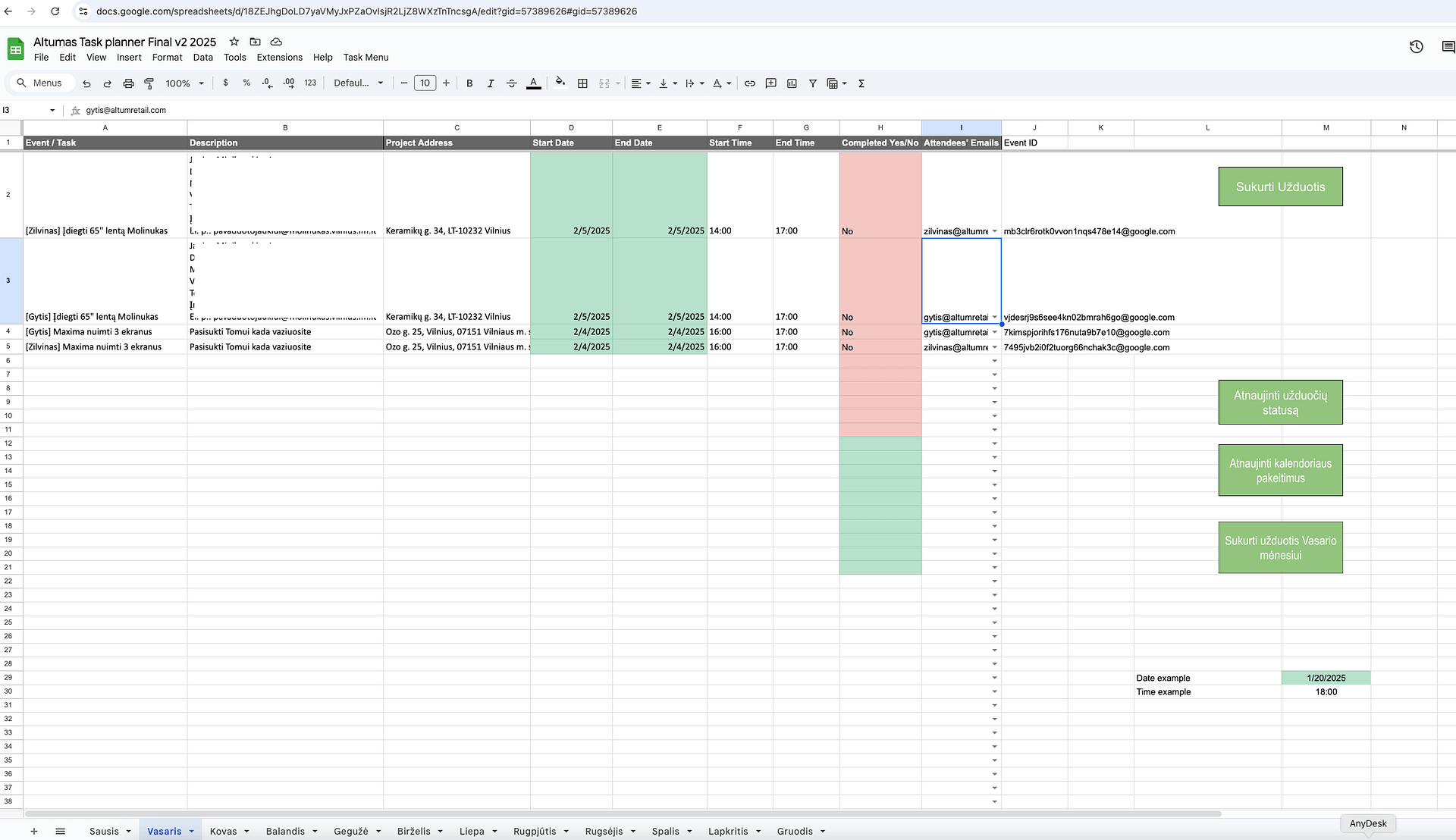 Darbuotojų dirbančių objektuose valdymui sukurėme patogų darbų planavimo įrankį. Sukėlus užduotis ir laikus į Google sheet dokumentą, jie nusiunčiami į darbuotojų kalendorius. Kad atsekti užduotis papildomai sukuriamos užduostys TASKS. Viskas valdoma per google sheets...